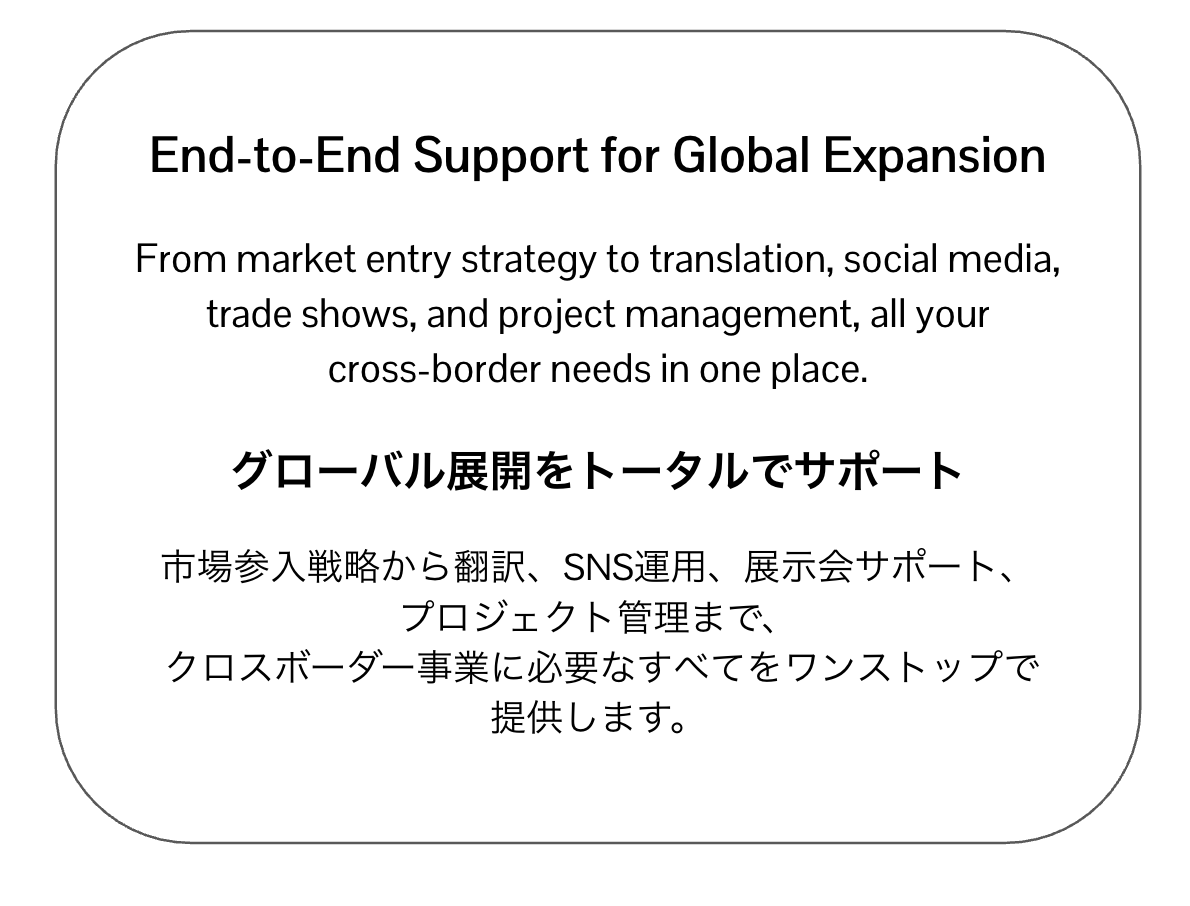 Somaid LLCは、国際営業支援、海外マーケティング戦略、翻訳・通訳サービス、展示会サポート、プロジェクトマネジメント、市場調査をワンストップで提供し、ブランドの海外展開を支援します。