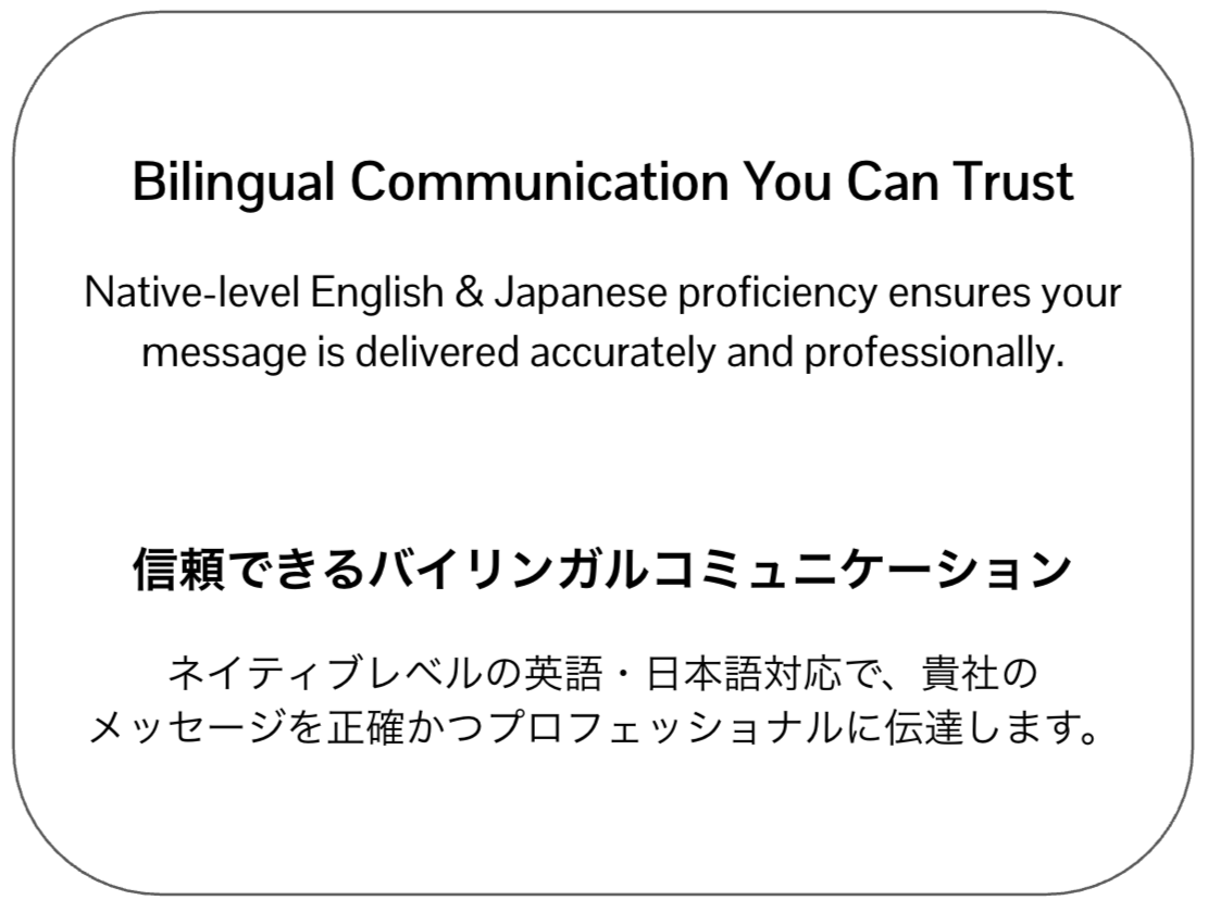 Native-level English–Japanese translation, proofreading, and interpreter support for meetings, documents, and business operations.